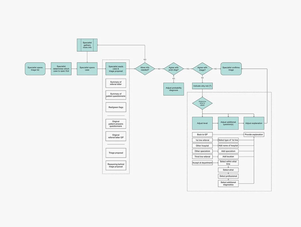 The specialist moves through the triage process by scanning cases, reviewing summaries, checking AI suggestions, and making adjustments when needed. Each step supports clinical decisions while saving time and keeping control in the right hands.